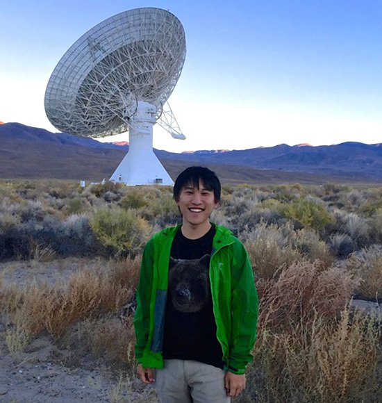 Dillon Dong, with a 40-meter radio dish at Caltech's Owens Valley Radio Observatory in the background.