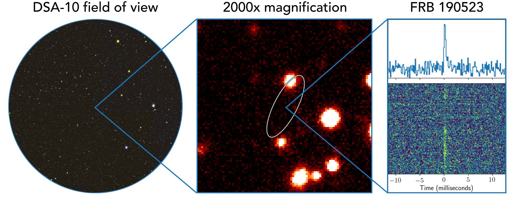 In a rare feat, researchers at Caltech's Owens Valley Radio Observatory (OVRO) have now caught a new burst, called FRB 190523, and, together with the W. M. Keck Observatory in Hawaii, have pinpointed its origins to a galaxy 7.9 billion light-years away. Identifying the galaxies from which these radio bursts erupt is a critical step toward solving the mystery of what triggers them.